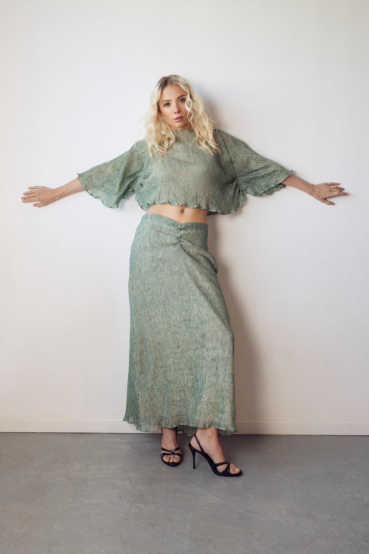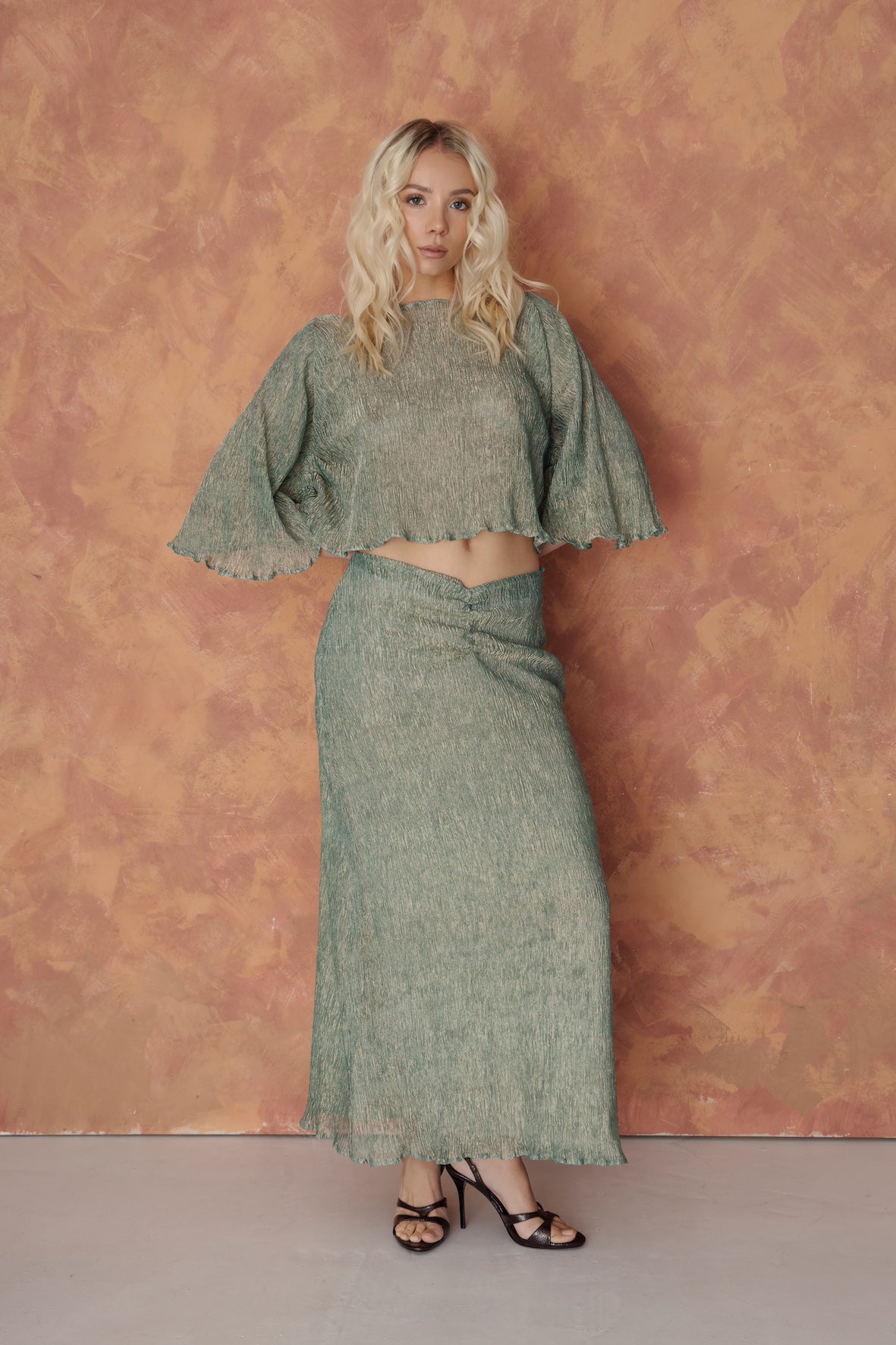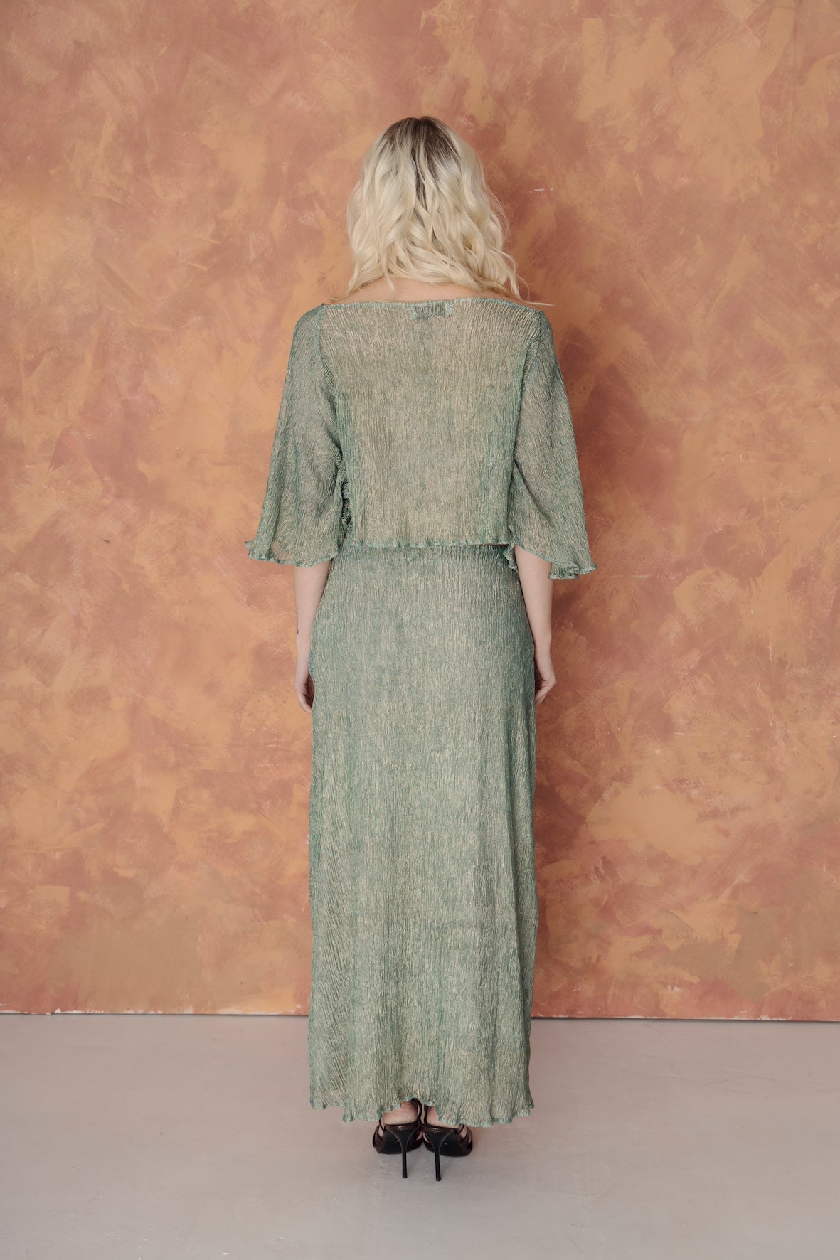 Our Chica top green is made of a organza pleated fabric, it is a cape like top with a few stitches on the side to create the sleeves